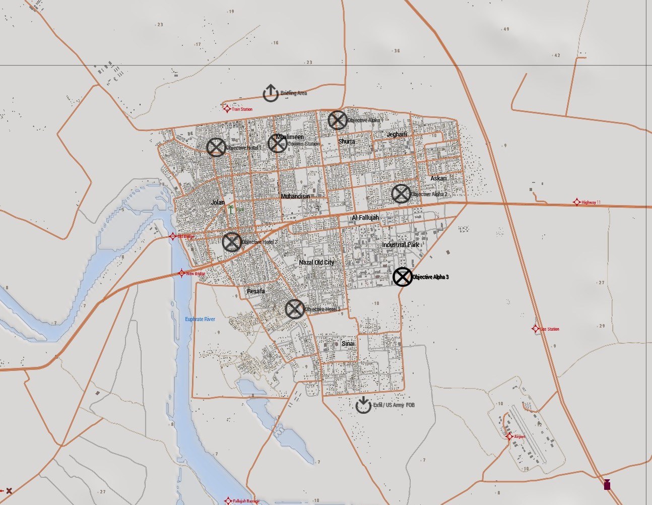 A 4-person team will travel to the Comms Center prior to mission brief, place explosives on the facility, then return to the briefing area to rejoin their squads prior to detonation. Hotel platoon will head southwest to Objective Hotel 1, and Alpha platoon will head southeast to Objective Alpha 1. Clear out and defuse the bombs at objectives 1-3 then link up with the US Army Rangers in the south end of the city where the Rangers will move into the city to secure the bombs.